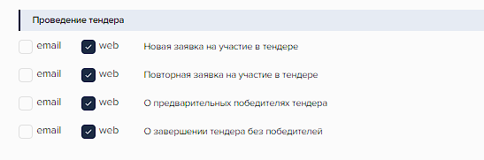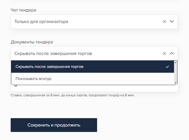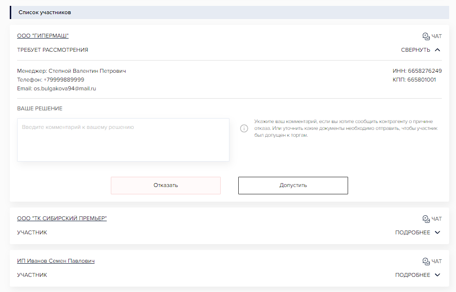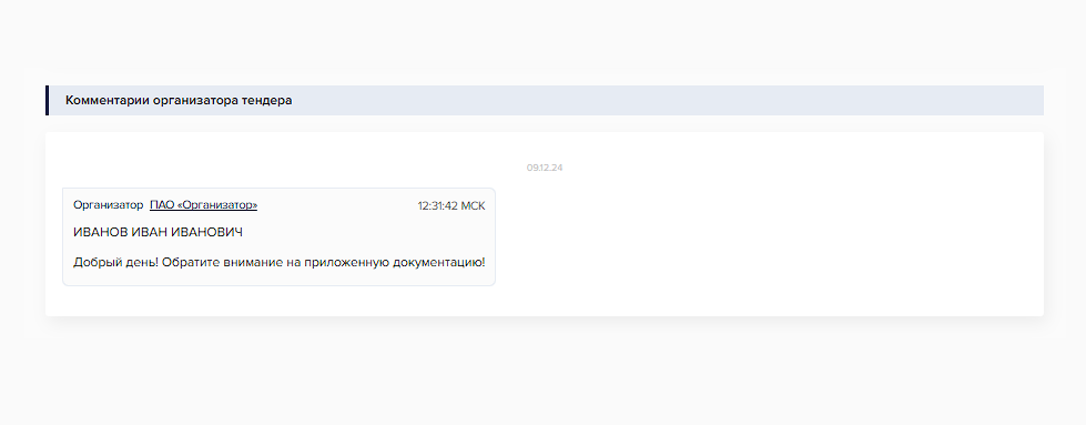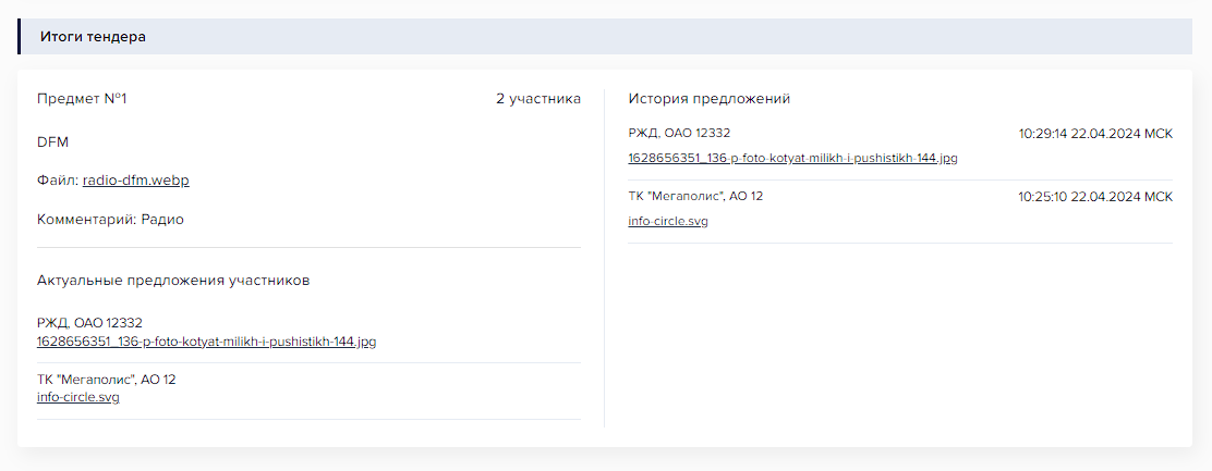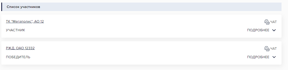 - Индивидуальные чаты организатора с поставщиком и общий чат организатора со всеми поставщиками в тендере.